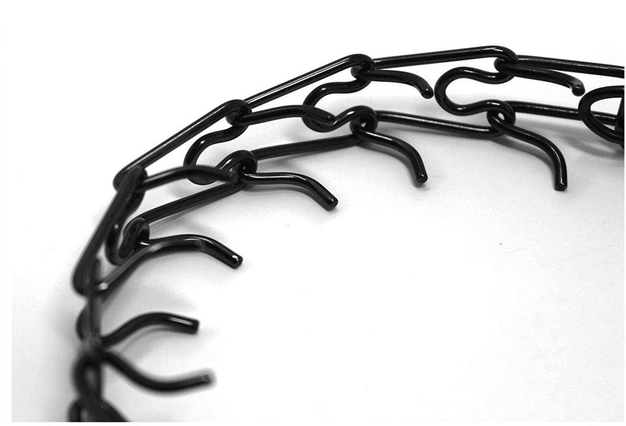 - Collar de puntas de acero inoxidable negro con hebilla de liberación rápida: este modelo viene con hebilla de liberación rápida ClicLock; Tamaño pequeño: 2,25 mm x 16 pulgadas de longitud total del collar, para perros con un tamaño de cuello de hasta 13 pulgadas, tamaño mediano, 3,2 mm х (23 pulgadas), tamaño grande 4 mm х24 pulgadas.