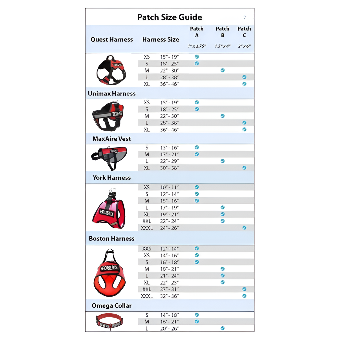 Sizes A, B, & C fit perfectly on our UnimaxQuest Harnesses and MaxAire Vests.