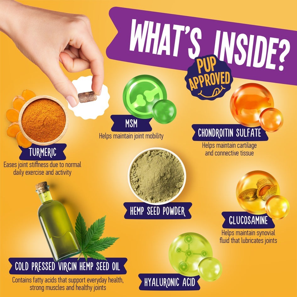 Powerful Active Ingredients: These mobility chews are enriched with hemp seed oil extract, glucosamine, turmeric, chondroitin, and MSM, a special blend that works synergistically in order to provide maximum efficiency and bioavailability!