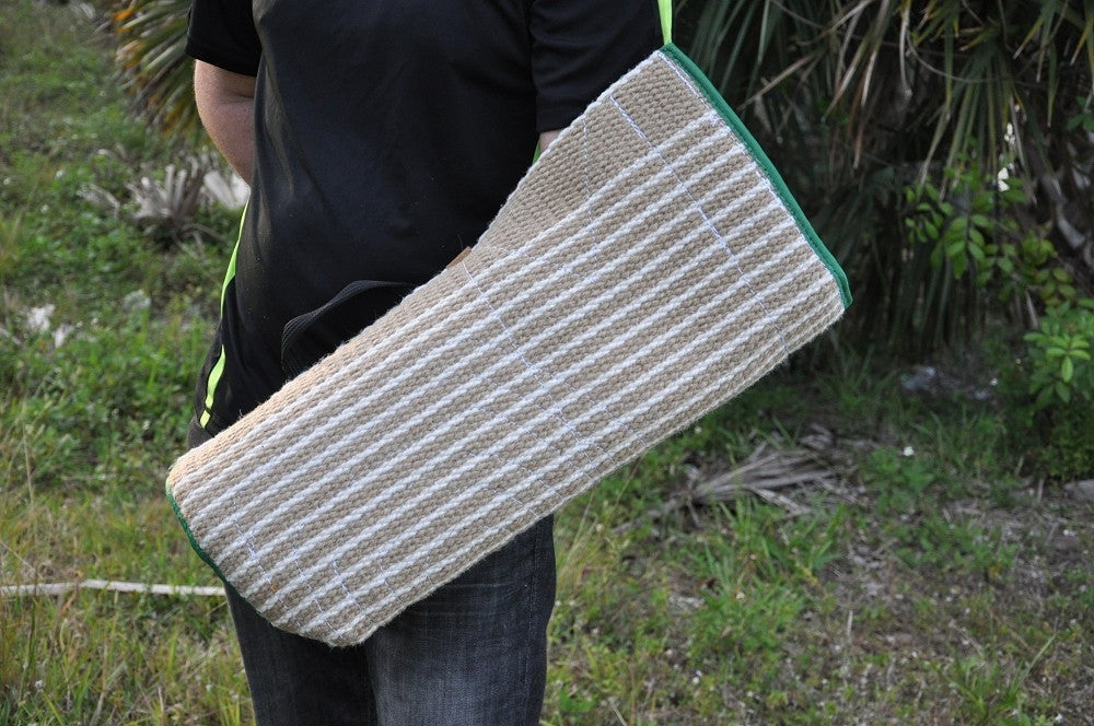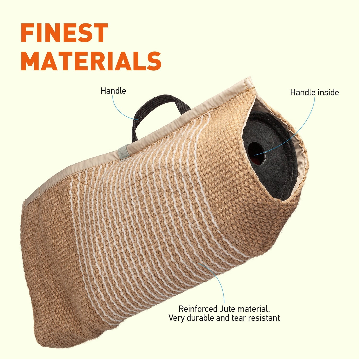Level 3 bite sleeve perfect for entry level dog training. Sleeve covers the trainer's entire forearm. It includes an internal soft-grip handle and an external handle. Can be used on both right and left arm. Has the option of attaching a shoulder guard (sold separately). Made of high quality jute material, it is tear-resistant and durable. Jute sleeves are great for puppies as it is easier for them to grasp than other fabrics.